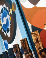 1. RYTHMES I 2024 - Peinture acrylique et aérosol sur toile. 2. HAVANE II 2025 - Peinture acrylique et aérosol sur toile. 3. TOTEMS (série) 2025 - Série de totems en sapin brûlés et vernis. 4. Trophée All Star Game U21 2025 - Laiton